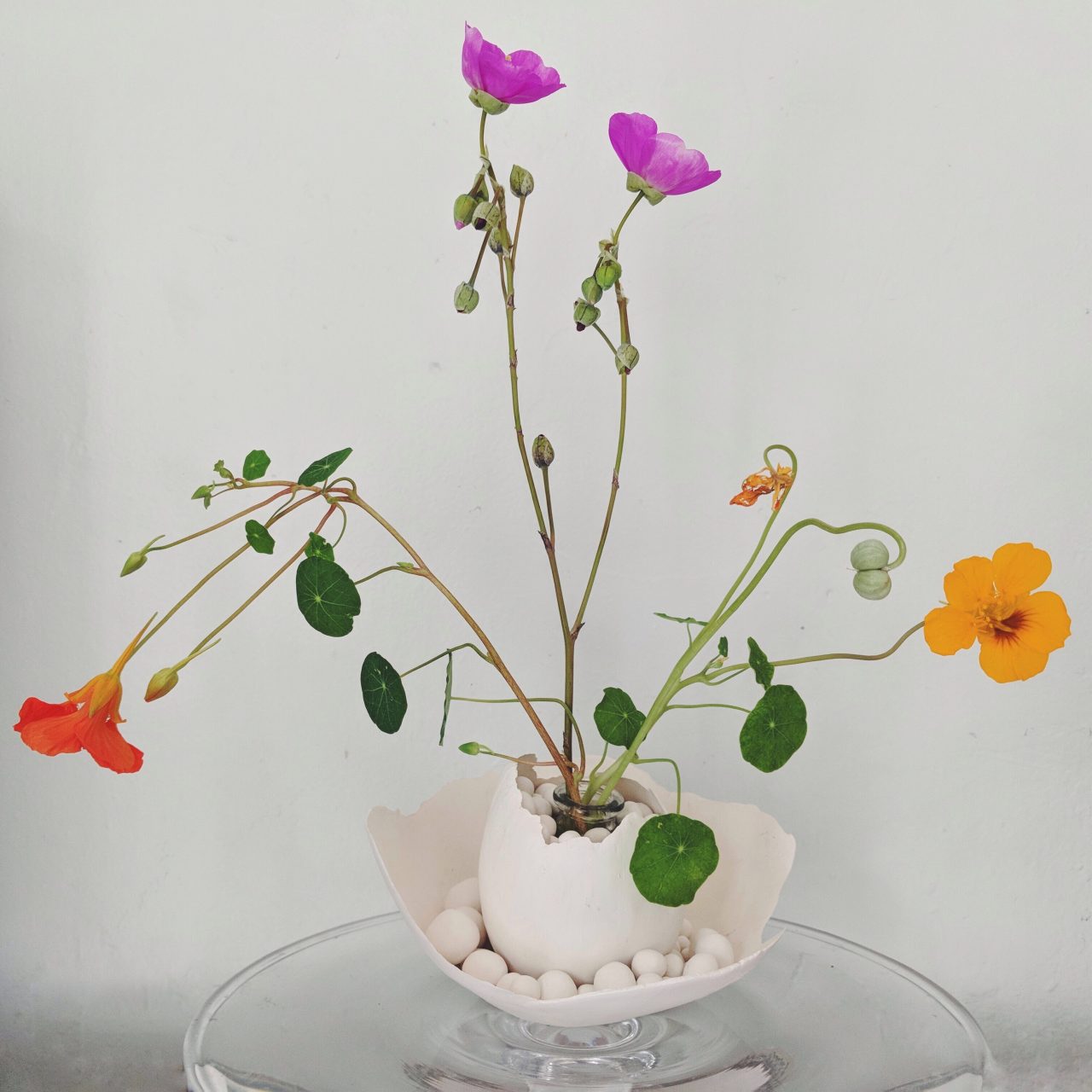 nasturtium/tropaeolum, calandrinia spectabilis, porcelain, glass.