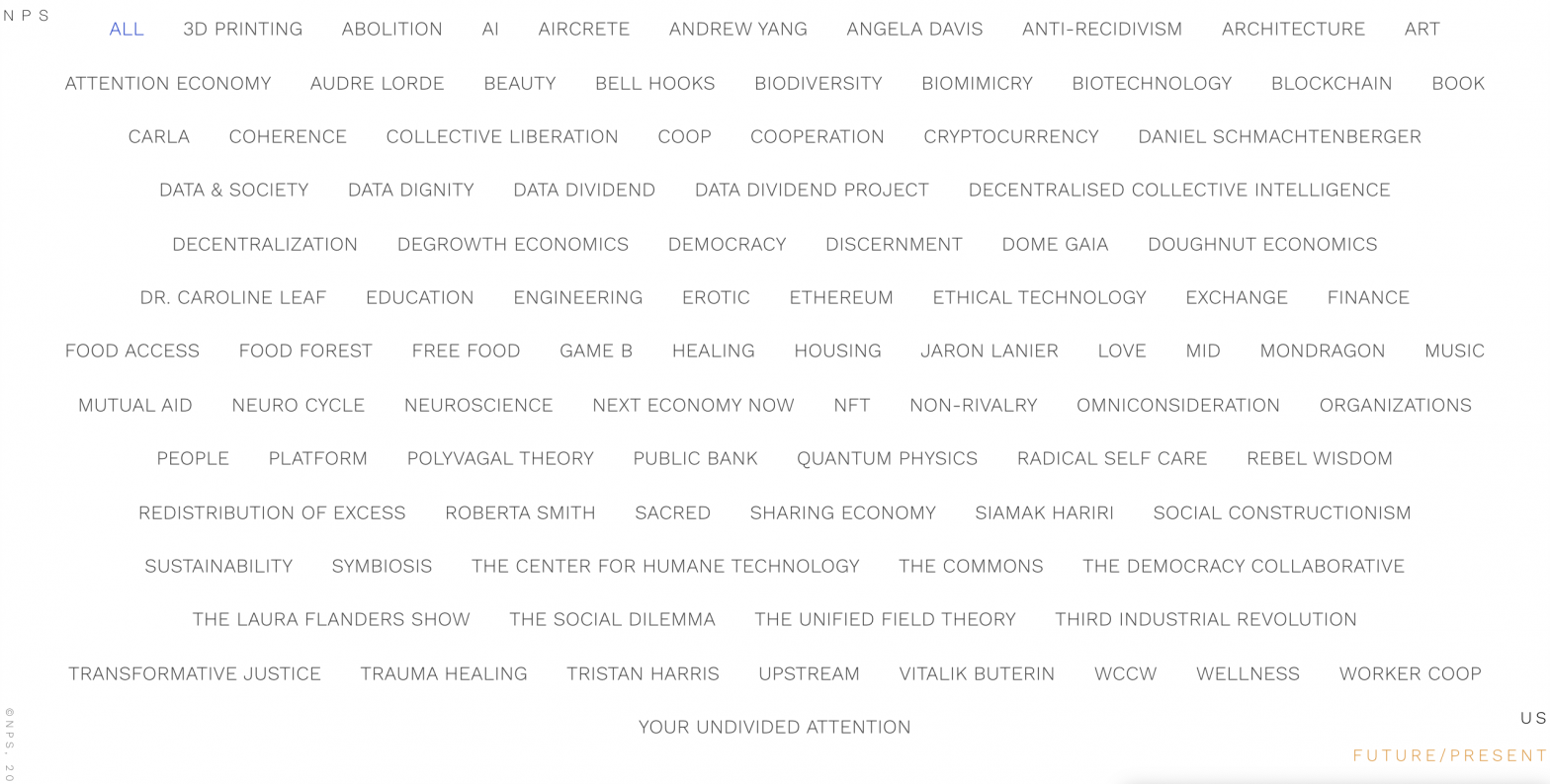 The future/present is research project to amplify emergent visions for society, that are rooted in a culture of care, mutual reciprocity and the implementation of exponentially evolving technology for the benefit of all kind.